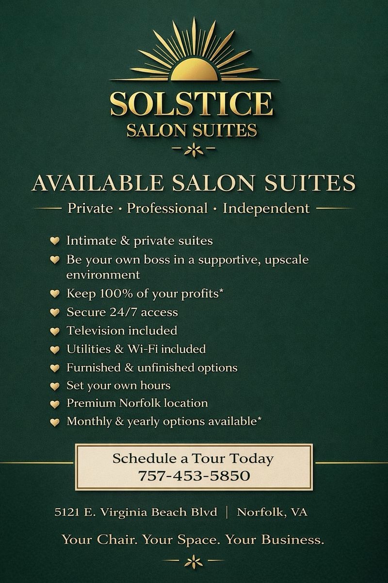 Enjoy the freedom of your own private suite — a quiet, professional space designed just for you.Perfect for hairstylists, estheticians, and wellness experts who value privacy and control.